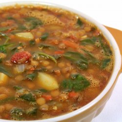 2Cover bacon mixture with chicken broth, water, and salsa; mix in lentils, bay leaf, cumin, rosemary, salt, and pepper. Bring to a boil over high heat; reduce heat to low, cover, and simmer until lentils are tender, 40 to 50 minutes. Stir in spinach and potatoes; simmer until spinach is wilted and potatoes are cooked, 10 to 15 minutes longer.
