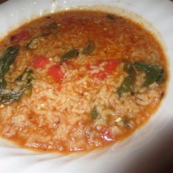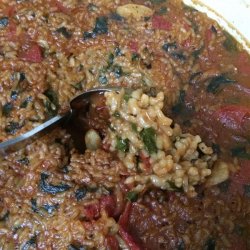 2Mix rice in the reserved oil until evenly coated; add tomatoes and cook, stirring frequently, until toasted and fragrant, about 10 minutes. Stir beef broth and spinach into tomato mixture; cook and stir for 5 minutes.
