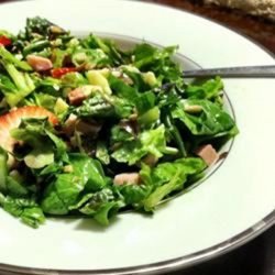 1Place the romaine, radicchio, escarole, and red leaf into a colander. Rinse, drain and set aside. Rinse the peas and cut into thirds. Transfer the mixed greens and peas into a large bowl, and gently toss in the cheese, ham and strawberries. Set aside.