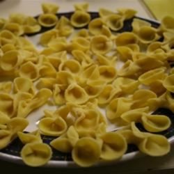"Real old fashioned homemade pasta. The salt, baking powder and butter are optional. Also, try substituting 1/2 cup milk or 3 beaten eggs for the warm water."