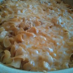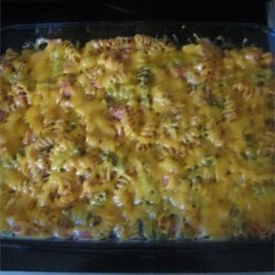 3Place the cooked pasta into a large mixing bowl, and add the cream of mushroom soup, ketchup, green chiles, onion, and luncheon meat. Pour into a 9x13 inch baking dish, and evenly sprinkle with the Cheddar cheese.