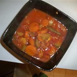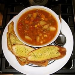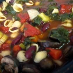 "Hearty and filling vegetarian soup with potatoes, carrots, celery, onion, garlic, beans and pasta. Make sure you have the storage for the left-overs."