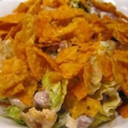 "A quick and easy summertime salad that is sure to become a family favorite. A combination of raw vegetables, canned beans, and pre-packaged nacho-flavor chips makes this dish a delight for any cook to make."