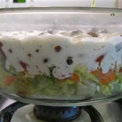 1Place the shredded lettuce in a large, flat dish. Layer with cucumbers, green onions, green bell pepper, cauliflower, baby carrots, broccoli, and radishes. Pour drained beans over the vegetables. Cover with Ranch-style dressing, and top with nacho-flavor tortilla chips. Cover, and chill until serving.