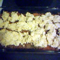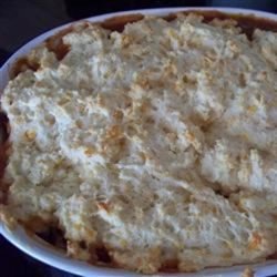 3In a medium bowl, stir together 1 cup of flour, baking powder, mustard powder and 1/2 teaspoon of salt. Cut in 2 tablespoons of shortening until only small lumps remain, then stir in the cheese and milk to make a thick batter. Spoon over the top of the casserole, and spread evenly.