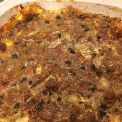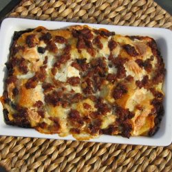 3Spread bread squares into the bottom of a baking dish. Layer mozzarella cheese atop the bread and top with sausage. Pour the egg mixture over the entire dish. Cover the baking dish with plastic wrap and refrigerate 8 hours to overnight.