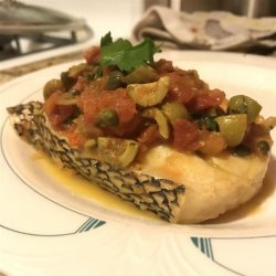 2Place sea bass into sauce. Cover, and gently simmer for 10 to 12 minutes, or until fish flakes easily with a fork. Transfer fish to a serving plate, and keep warm.