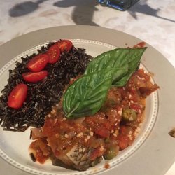 1Heat oil in a large skillet over medium heat. Saute onions until soft. Stir in garlic, and saute about 1 minute. Add tomatoes, and cook until they begin to soften. Stir in wine, olives, capers, and red pepper flakes. Heat to a simmer.