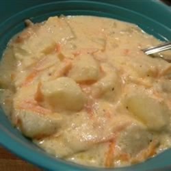2Add butter or margarine, bacon bits and fat, and carrots. Stir in milk, parsley, and instant potatoes; bring to a light boil. Salt and pepper to taste. Cover, and simmer on low until you are ready to eat.