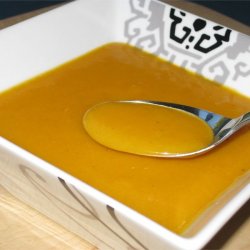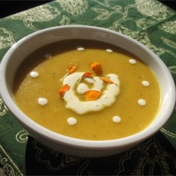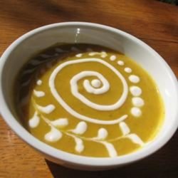 2Pour the soup into a blender, filling the pitcher no more than halfway. Securing the lid of the blender with a folded kitchen towel, start to blend using a few quick pulses before allowing to blend continually; puree in batches until smooth. Divide into eight soup bowls; garnish each portion with about 1/2 tablespoon heavy cream and a sprig of parsley.