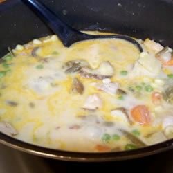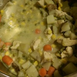 2Mix the onion into pot with the chicken. Mix in potatoes, carrots, peas, and corn. Pour in milk an enough water to cover all ingredients. Season with hot sauce, salt, and pepper. Bring to a boil. Reduce heat to low, and continue cooking 30 minutes, stirring occasionally, until potatoes are tender.