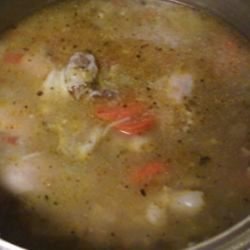 1Clean chicken thoroughly in fresh, cold running water and remove giblets. Remove as much excess skin from bird as possible and discard. With the force of your hands, add pressure to the back bone of the chicken to crush the bones. If you crack the legs at the joints it will release the cartilage which will add more flavor to the soup. Place crushed chicken and giblets into a large stock pot.