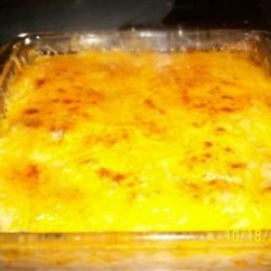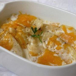 "Potatoes cooked in heavy cream with Parm cheese, topped with Cheddar cheese. Not for those on a low fat diet! I never use measurements, so go with your gut!"