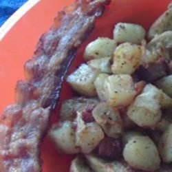 3Add potato chunks, onion and crumbled bacon to skillet. Cook over medium high heat until potatoes begin to brown and onions are translucent, about 25 minutes.