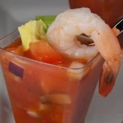 1Pour tomato-vegetable juice cocktail into a bowl. Gently stir in shrimp, cucumbers, avocados, canned diced tomatoes, fresh tomatoes, red onion, jalapeno pepper, garlic, horseradish, salt, and hot pepper sauce until thoroughly combined. Chill in refrigerator and serve in martini glasses.