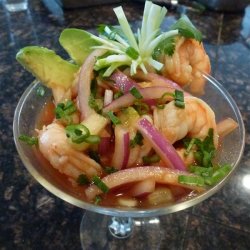 "Surprise your guests with this delicioso appetizer! This Mexican shrimp cocktail begins any taco, enchilada, burrito, or tostada night with a bang! Don't expect to have anything left over but an empty dish. Try it without the shrimp for those who don't like seafood. Serve with saltine crackers or tortilla chips as an alternative! Enjoy!"