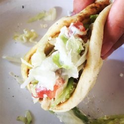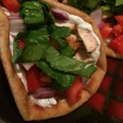 5Place pita rounds on the grill, and cook for about 2 minutes, until warm, turning frequently to avoid burning. Arrange warmed pita, sliced chicken, lettuce, onion, tomato, olives, and pepperoncini on a serving platter. Serve tzatziki sauce and feta cheese in separate bowls on the side. Stuff pita pockets with chicken and toppings to serve.