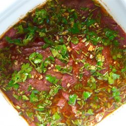 1Combine the orange, lemon, and lime juice in a large glass or ceramic bowl along with the garlic, soy sauce, chipotle pepper, chili power, ground cumin, paprika, dried oregano, black pepper, and cilantro. Slowly whisk in the olive oil until marinade is well combined. Remove one cup of the marinade and place in a small bowl, cover with plastic wrap and refrigerate for use after the meat is cooked.
