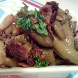 mushrooms, cream sauces, canned onions, and cheese, this is for you. No oven needed here; a big plus. Using an electric skillet frees up your stove top as well. Fresh is always best, but beans of quality may be hard to find this time of year. Canned or frozen instead will make a good dish. The optional use of yellow wax beans is an eye-pleaser and provides an interesting taste variation. Bump up a like amount of green beans if yellow beans are not used."