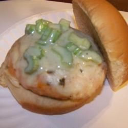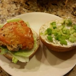 4To assemble the burgers, place a lettuce leaf on each roll bottom. Top with a burger patty, then spoon on 2 tablespoons of blue cheese sauce, and 2 tablespoons celery. Place the top of the roll on top to finish the sandwich.