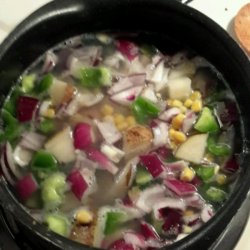 In a large pot over high heat, combine potatoes, carrots, onion, green bell pepper, corn and water. Boil until tender, then add bouillon.