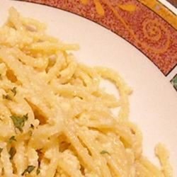 "Noodles with garlic, butter and grated Italian cheese. Serve with crunchy bread sticks and salad, if desired."
