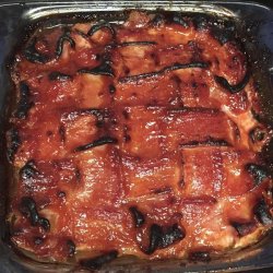 2In a medium bowl, mix together ground beef, crushed crackers, onion, eggs, 3/4 cup ketchup, and 1/4 cup brown sugar until well blended. Press into a 9x5 inch loaf pan. Lay the two slices of bacon over the top.