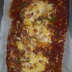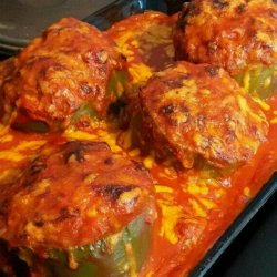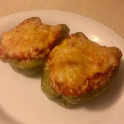 "Here's a delicious stuffed pepper recipe that's easy to make. Each green bell pepper contains ground beef, onion, tomatoes, rice and cheese, and is cooked in tomato soup."