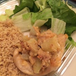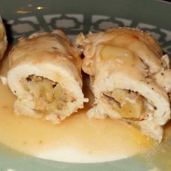 2Flatten chicken breasts between sheets of waxed paper to 1/4 inch thickness. Divide apple mixture between chicken breasts, and roll up each breast. Secure with toothpicks.