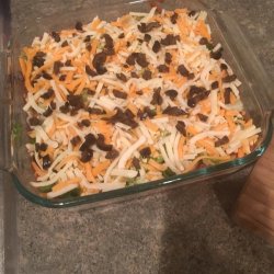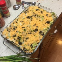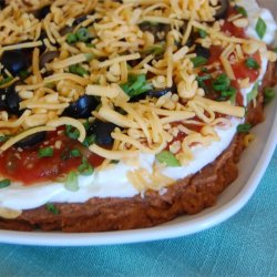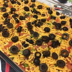 3Top the layers with salsa. Place a layer of tomato, green bell pepper, green onions and lettuce over the salsa, and top with Cheddar cheese. Garnish with black olives.