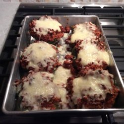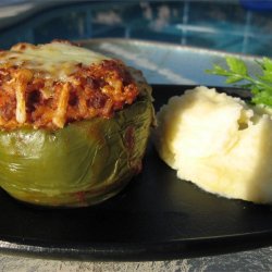 5Spoon the meat mixture onto each half of the green peppers. Bake in the preheated oven for 45 minutes or until mixture begins to turn golden brown.