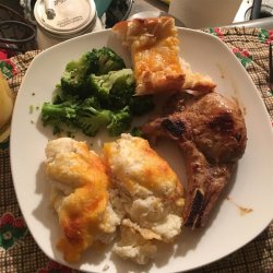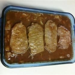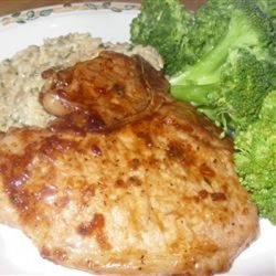 2Place the pork chops in a skillet over medium heat, and cover with the dressing mixture. Cover skillet, and cook pork chops 25 minutes, turning occasionally. Remove cover, reduce heat to low, and continue cooking to desired doneness.