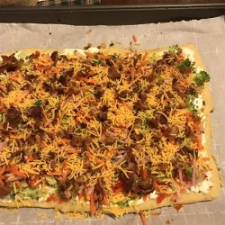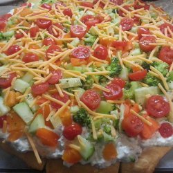 4In a medium-sized mixing bowl, combine sour cream, cream cheese, dill weed, garlic salt and ranch dip mix. Spread this mixture on top of the cooled crust. Arrange the onion, carrot, celery, broccoli, radish, bell pepper and broccoli on top of the creamed mixture. Cover and let chill. Once chilled, cut it into squares and serve.