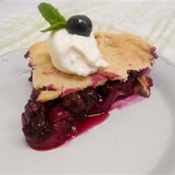 5Roll out the remaining pastry for the top crust. Stir the berry mixture and pour the filling into the pastry-lined pie plate. Place the top crust over the pie and trim the edges, leaving a 1/2-inch overhang. Fold the top crust under the bottom crust, pressing lightly to seal. Crimp the edges of the crust and cut vents in the top to allow steam to escape. To prevent over-browning, cover the edge of the pie with foil.
