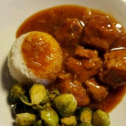 3In a separate medium bowl, mix together the water, vinegar, ketchup, cornstarch, sugar and soy sauce. Pour over the meatballs, and allow sauce to thicken. Continue to heat until the sauce just starts to bubble.