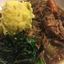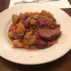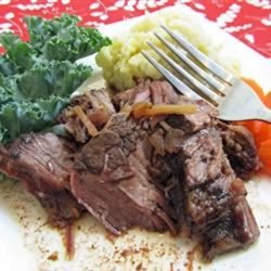 "Moist and juicy pot roast done in a slow cooker with carrots, onion and potatoes."