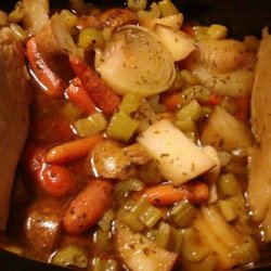 Place the roast in the slow cooker and add the soup mix, water, carrots, onion, potatoes, and celery.