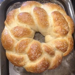 6Lightly beat remaining egg and brush loaf. Sprinkle with sesame seeds. Bake in preheated 350 degree F (175 degrees C) oven for about 55 minutes until nicely browned. May be made into two regular sized loaves. Reduce baking time slightly.
