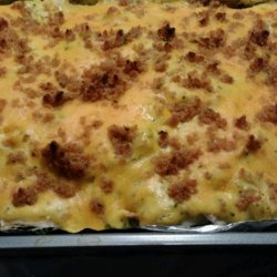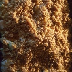 3Place the cooked broccoli in a 9 inch pie plate. Top with the chicken. In a bowl, mix the soup and milk, and pour over the chicken. Sprinkle with Cheddar cheese. Mix the melted butter with the bread crumbs, and sprinkle over the cheese.