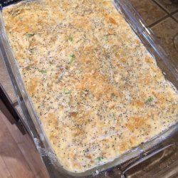 2Mix together the cracker crumbs, melted butter, and poppy seeds in a bowl. Layer the bottom of a 9x13-inch glass baking dish with 2/3 of the cracker mix. Mix the chicken breast pieces with cream of chicken soup and sour cream until thoroughly combined, and spoon the mixture on top of the crumb crust. Sprinkle remaining 1/3 of the cracker mix over the top of the chicken mixture.