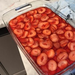 3In a medium bowl, stir together the gelatin mix and boiling water. Mix in frozen strawberries, and stir until thawed. Pour over cream cheese mixture in pan. Refrigerate until completely chilled, at least 1 hour.