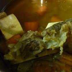 5Bring mixture to a boil. Reduce heat. Cover and simmer for 5 hours. Strain stock. Discard meat, vegetables, and seasonings.