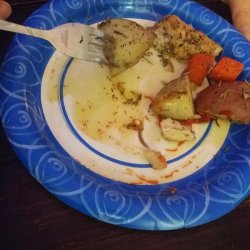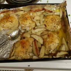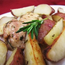 "This is a one pan meal that's in the oven in 15 minutes. Rosemary, garlic, and oregano create a mouth watering aroma. If using dried herbs in place of fresh, use 1/3 the amount. Potatoes are crispy like french fries, just serve with ketchup. Kids just love this!"