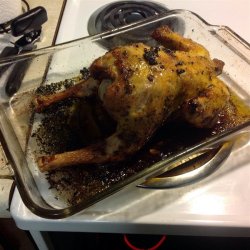3Place in a roasting pan, and bake about 90 minutes, until the juices run clear or until a meat thermometer inserted in thickest part of the thigh reaches 180 degrees F. Baste the chicken with the sauce every 20 minutes while it's cooking. Allow chicken to rest for 10 minutes before carving.