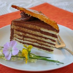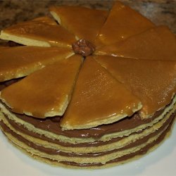 5Place 1 cup sugar into a non-stick skillet over medium heat. Allow sugar to cook until the edges look melted and brown. Begin stirring with a wooden spoon. Cook until the sugar become an amber color, and is smooth. Carefully pour the caramel over the top of the last layer, and spread to the edges with an oiled knife. Quickly, using an oiled knife, indent the top of the caramel into 16 wedges. Allow to cool slightly, and then retouch the indents with the knife again. Place layer onto a counter top dusted with sugar, and allow the caramel to cool completely.