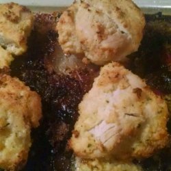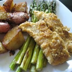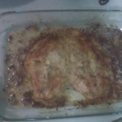 3Melt butter and pour into the bottom of a 9x13 inch baking dish. Mix together the bread crumbs, Parmesan cheese, parsley, garlic powder, salt and pepper. Dip marinated chicken in crumb mixture. Place coated chicken in baking dish, and pour remaining egg mixture over.