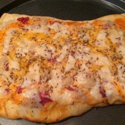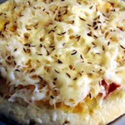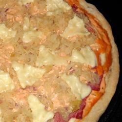 3Spread half of the salad dressing over the hot crust. Sprinkle with half of the Swiss cheese. Arrange corned beef over the cheese, then drizzle with the remaining salad dressing. Top with sauerkraut and remaining Swiss cheese. Sprinkle with caraway seed.