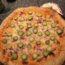 4Bake for another 10 minutes in the preheated oven, until cheese melts and toppings are heated through. Sprinkle with chopped pickle. Let stand for 5 minutes before slicing.