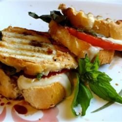2Sprinkle cut sides of roll with balsamic vinegar. Layer one slice of mozzarella cheese, tomato slices, basil leaves, and the remaining slice of mozzarella cheese on the roll. Close sandwich; rub outside with olive oil.
