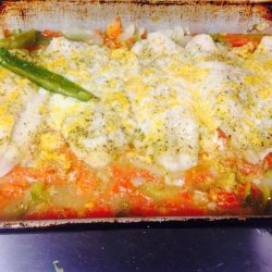 2Layer bell peppers, tomatoes, onion, cilantro, jalapeno pepper, and garlic in a baking dish. Drizzle olive oil over mixture; add juice from 1 lime and mix well. Arrange fish fillets over mixture and season with Creole seasoning. Sprinkle Mexican cheese blend over fish and add remaining lime juice. Cover dish with aluminum foil.